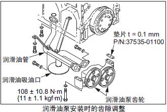 潤(rùn)滑油泵安裝在曲軸箱上后,測(cè)量曲軸齒輪和潤(rùn)滑油泵齒輪的齒隙。齒隙不符標(biāo)準(zhǔn)值時(shí),在潤(rùn)滑油泵安裝部位插入墊片進(jìn)行調(diào)整。