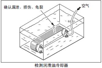 在三菱S6R發(fā)動機(jī)冷卻器芯的潤滑油通道部位,進(jìn)行1.5MPa{15 kgf/cm2} 的壓縮空氣測試,檢查芯部的損傷或龜裂。發(fā)現(xiàn)有漏泄時,更換新的冷卻器芯。