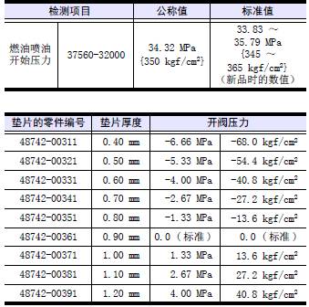 (3) 噴油開始?jí)毫νㄟ^增減墊片調(diào)整。墊片分0.40 ~1.20 mm 的9 種。參照下表進(jìn)行調(diào)整。