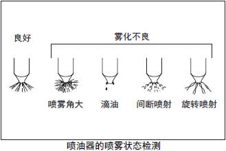 在噴油器試驗(yàn)臺(tái)上調(diào)整壓力的同時(shí),檢查噴孔堵塞、噴霧狀態(tài)以及噴孔內(nèi)有無漏油現(xiàn)象等。噴霧不良時(shí),清洗或更換噴油嘴。霧化檢測(cè)項(xiàng)目如下。筆直噴射。無大顆粒,微細(xì)噴霧。噴射后,噴孔無殘余油滴。