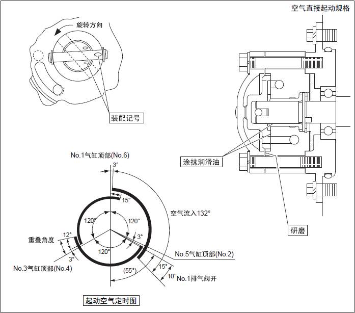 注: 三菱S6R柴油發(fā)動機分配閥組裝時,要對準裝配記號。安裝出錯時,360° 起動空氣定時會發(fā)生錯亂導致不能起動。