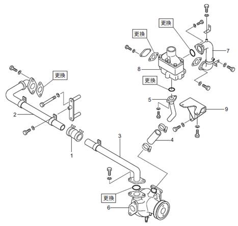 三菱S6R柴油發(fā)動機空氣冷卻器用水泵、恒溫器、水管的拆卸,檢修