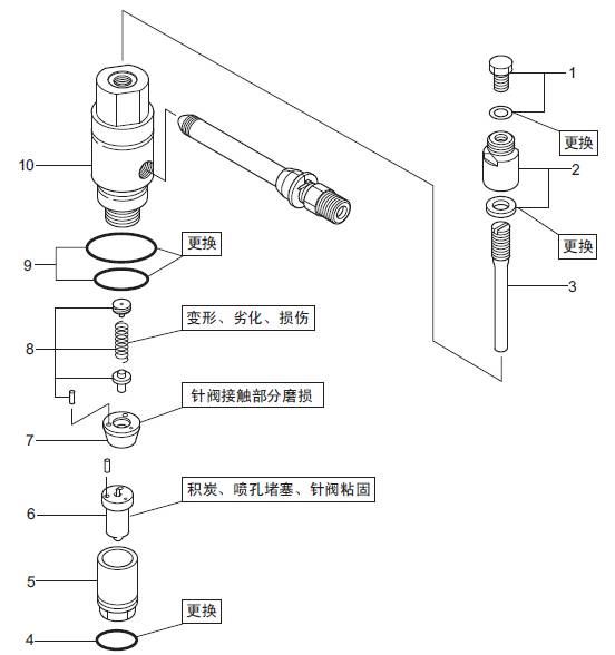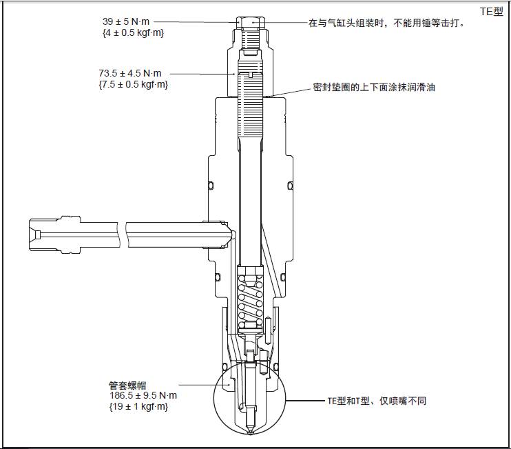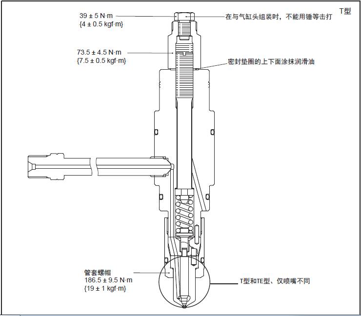 必須按照規(guī)定的扭矩緊固管套螺帽。旋緊過度時,會影響針閥的動作,引起排氣惡化或針閥卡死等故障。