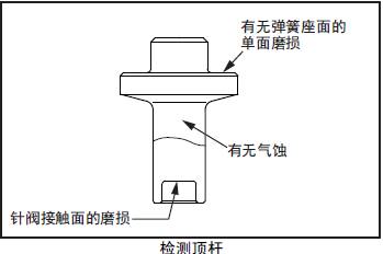 目測檢查頂桿,發(fā)現(xiàn)彈簧座單側(cè)磨損、針閥接觸面顯著磨損或下面錐部氣蝕時更換新的頂桿。