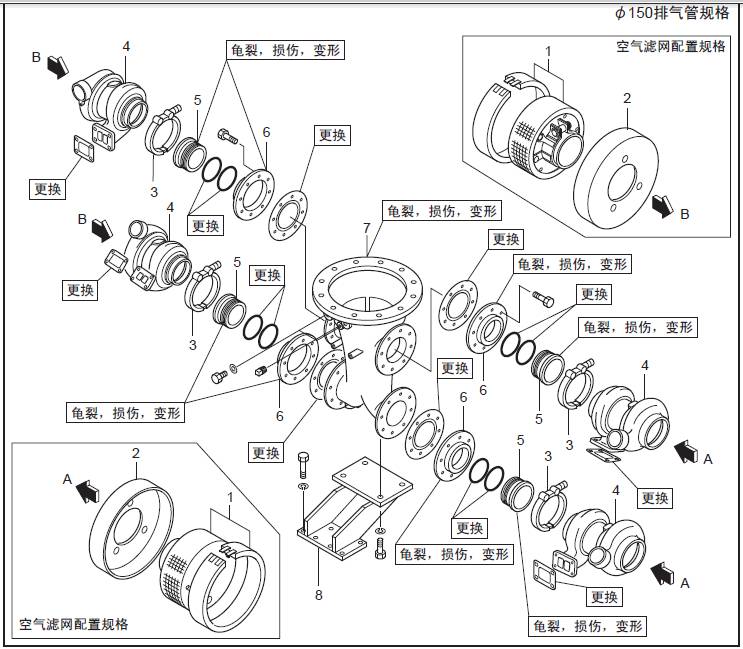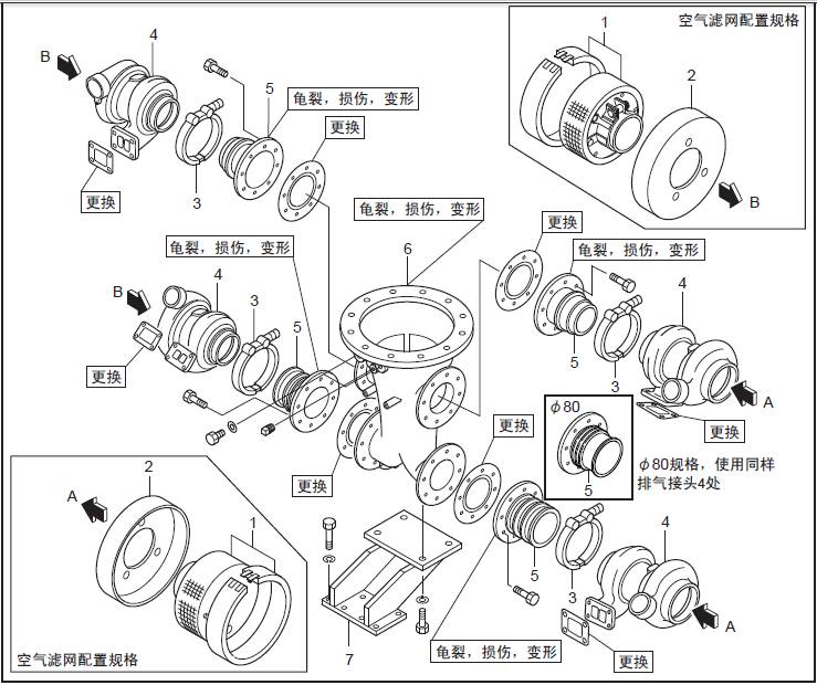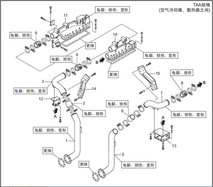 TAA規(guī)格(三菱S16柴油機空氣冷卻器、三菱R16柴油發(fā)動機三菱R16柴油發(fā)動機缸體之間) 空氣管的拆卸,檢修