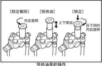 (3) 從放氣塞內(nèi)排出的燃油不含有氣泡時旋緊塞頭,但在旋緊最后的1個放氣塞前,先將預(yù)供油油泵的端蓋壓下向右旋回至原狀鎖定。