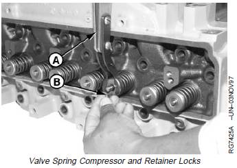 5. Compress valve springs using JDE138 Valve SpringCompressor (A) and install retainer locks (B) on valvestems.