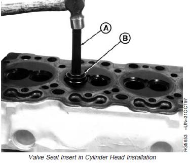 1. Use JDG676 Valve Seat Driver (A) and JDG675 ValveSeat Insert Installing Adapter (B) to install valve seatinserts in cylinder head.Use one end of JDG675 Adapter to install intake valveseat inserts and the other end to install exhaust valveseat inserts.