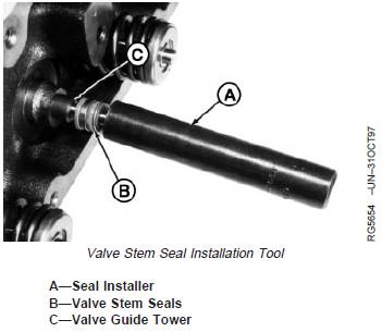 3. Use JDG678 Valve Stem Seal Installer (A) to slidevalve stem seals (B) over valve stems and onto valveguide tower (C).