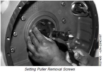 6. Tighten forcing screw (plate should pull evenly againstthe three screws) until seal and wear sleeve assemblyis removed from engine