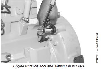 1. Using JDE81-1 or JDE83 Flywheel Turning Tool and JDG1571 or JDE81-4 Timing Pin, lock No. 1 piston at TDC compression stroke.