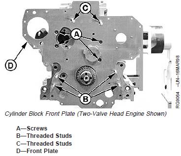 NOTE: On earlier engines1, there are two countersunk TORXâ screws used in place of threaded studs(C). On four-valve head engines, double ended studsare used to hold the fuel injection pump andtiming gear cover. Remove if needed.