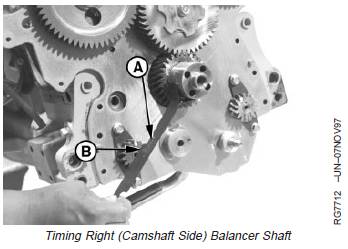 9. Turn left (injection pump side) balancer shaft so timing mark on gear is aligned with JD254A (JD-254A) Timing Tool (A).