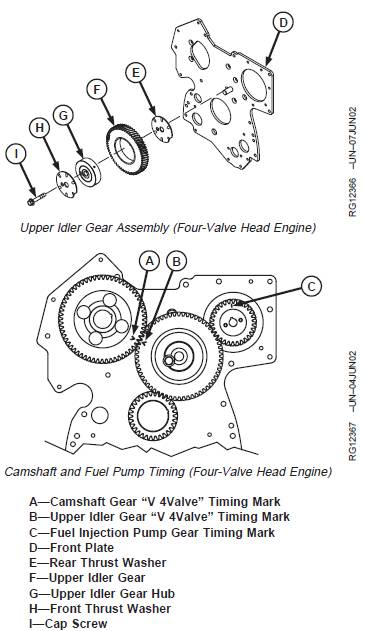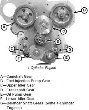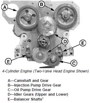 · Injection pump drive gear (B) and injection pump. See Section 02, Group 090 of CTM207 (Mechanical Fuel Systems), CTM170 (Level 4 Electronic Fuel Systems), CTM331 (Level 12 Electronic Fuel Systems), CTM284 (Level 1 Electronic Fuel Systems) or CTM220 (Level 11Electronic Fuel Systems with Denso High PressureCommon Rail).