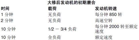 重要提示: 在磨合初期,定時檢查機油壓力和冷卻液溫度。還應該檢查燃油、機油或冷卻液是否有泄漏跡象。一次全負荷運轉(zhuǎn)時間不能超過 10 分鐘。