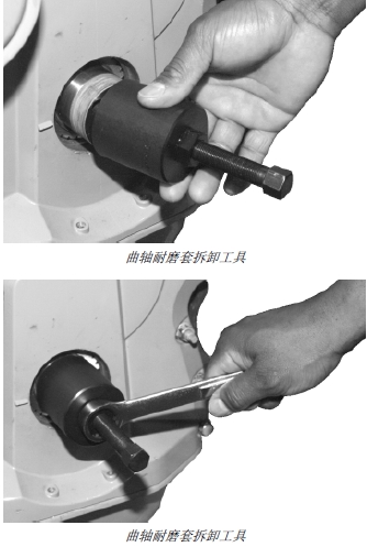 2. 退出緊固螺釘,將 JDG992-1 前耐磨套拉拔器工具中的夾頭放到曲軸的凸輪緣上,直到螺紋內(nèi)徑接觸到耐磨套。