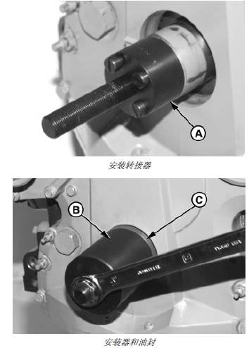 重要提示: 為保證安裝正確,曲軸和耐磨套外徑必須要用 Brake Kleen、IgnitionCleaner 或等效產(chǎn)品進(jìn)行清洗,風(fēng)干后再安裝油封 (C)。