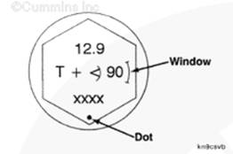 為了精確地使螺釘轉(zhuǎn)動到要求的角度,使螺釘與螺釘頭上標(biāo)記的“小圓點(diǎn)”和“窗口”對正,或者使用推薦的扭矩角度計 - 19 mm [3/4-in] 驅(qū)動頭(零件號 3823878)或等同物。