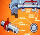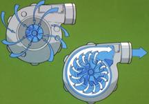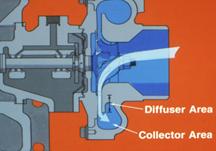 康明斯增壓器的渦輪端:1)渦輪殼接到發(fā)動機排氣管道上,2)廢氣驅(qū)動渦輪殼中的渦輪葉輪,3)渦輪葉輪帶動同軸上的壓葉輪