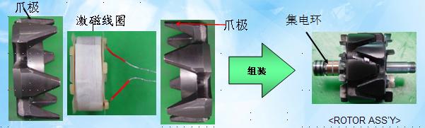 3). 轉(zhuǎn)子: 激磁線圈兩端各自連接在SLIP RING,依據(jù)發(fā)動機旋轉(zhuǎn)并通過刷子收到激磁電流而爪極被磁化(N,S極)使定子里產(chǎn)生交流電流.
