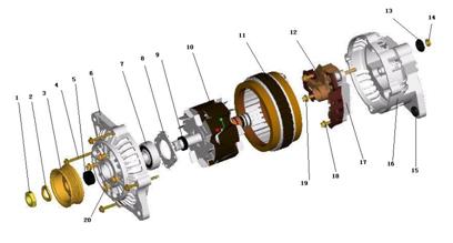 1.螺母 2.彈簧墊圈 3.皮帶輪 4.貫通螺栓 5.限位圈 6.驅(qū)動端蓋 7.軸承 8.軸承蓋 9.限位圈 10.轉(zhuǎn)子 11.定子 12.調(diào)節(jié)器 13.絕緣套 14.螺母 15.補償套 16.電刷端蓋 17.整流橋 18.螺釘 19.螺釘