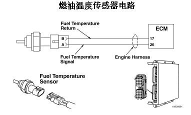 ECM 使用燃油溫度傳感器監(jiān)測(cè)燃油溫度。ECM 監(jiān)測(cè)觸針 26 上的電壓并將它轉(zhuǎn)換成溫度值。燃油溫度數(shù)值由 ECM 用于發(fā)動(dòng)機(jī)保護(hù)系統(tǒng)。