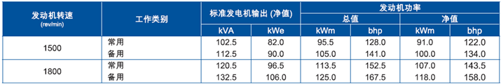 上表所有額定功率數(shù)據(jù)均為配備標準尺寸風扃與驅動器比率的發(fā)動機,ISO/TR 14396/IS0 8528條件下操作時數(shù)據(jù)。有關上述條件以外操作的數(shù)據(jù)請咨詢珀金斯公司,Perkins提供的性能公差為±5%。電氣參數(shù)假設功率因數(shù)為0.8與發(fā)動機效率90%。