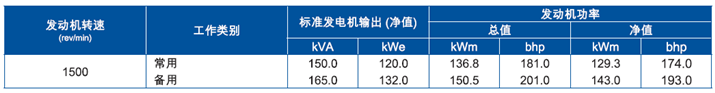 上表所有額定功率數(shù)據(jù)均為配備標(biāo)準(zhǔn)尺寸風(fēng)扃與驅(qū)動(dòng)器比率的發(fā)動(dòng)機(jī),ISO/TR 14396/IS0 8528條件下操作時(shí)數(shù)據(jù)。有關(guān)上述條件以外操作的數(shù)據(jù)請(qǐng)咨詢珀金斯公司,Perkins提供的性能公差為±5%。電氣參數(shù)假設(shè)功率因數(shù)為0.8與發(fā)動(dòng)機(jī)效率90%。