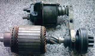 直流電動機(jī)常采用串激直流電動機(jī),其特點(diǎn)是低速時(shí)轉(zhuǎn)矩很大,P=πnT,隨轉(zhuǎn)速n↑,轉(zhuǎn)矩T↓,這一特征非常適合發(fā)動機(jī)起動的要求。