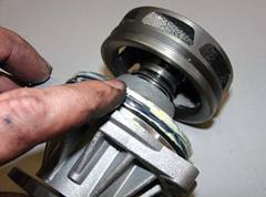 (5)水封 作用是密封冷卻液以免泄漏,同時將冷卻液與水泵軸承隔離,以保護軸承。目前水泵上已經(jīng)廣泛使用了雙層陶瓷水封,2片同軸安裝的陶瓷水封被螺旋彈簧壓緊貼在一起。與橡膠水封相比,陶瓷水封更耐磨損,使用壽命更長,但是也存在容易被冷卻液中的硬質(zhì)顆粒擦傷的缺點。雖然水封的加工得到了不斷的改進,但是水封損壞導致水泵漏水仍然是水泵損壞的主要原因。