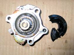 (1)葉輪損壞 葉輪損壞的常見形式有葉輪開裂、葉輪從泵軸上松脫或葉輪腐蝕,葉輪腐蝕一般不會造成發(fā)動機故障。葉輪開裂或葉輪從泵軸上松脫后,冷卻液循環(huán)速度變慢,容易引起發(fā)動機溫度過高的故障。損壞的葉輪在旋轉(zhuǎn)時還可能撞擊水泵殼體,造成殼體碎裂。