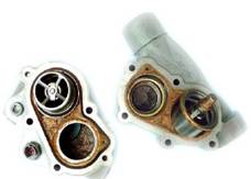 (1)殼體 水泵殼體由鑄鐵或鑄鋁制成。鑄鐵殼體壁厚且質(zhì)量大,很多鑄鐵殼體上還帶有部分水道和節(jié)溫器安裝室,這使得殼體的重量進一步增加。大多數(shù)水泵采用了鑄鋁殼體,而且殼體的尺寸越來越小,很多殼體已經(jīng)不再具有水道的功能。