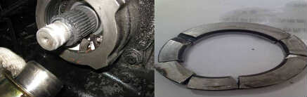 處理方法: 拆法蘭檢查輸出軸總成及相關(guān)零部件損壞程度: 一種情況是止推墊塊碎,輸出軸及軸承未損傷,不需拆總成,僅更換油封、止推墊塊、輸出法蘭及鎖緊螺母,在輸出軸上涂密封膠。