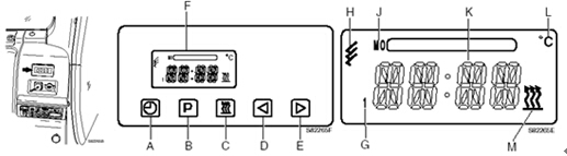 沃爾沃VOLVO B 系列挖掘機發(fā)動機柴油加熱器 A時間設(shè)置開關(guān) B程序開關(guān) C加熱“開/關(guān)”開關(guān) D倒退開關(guān) E前進(jìn)開關(guān) F顯示窗口G記憶指示器 F遙控器符號 J程序日 K當(dāng)前時間/計劃時間 L溫度顯示器 J加熱指示器