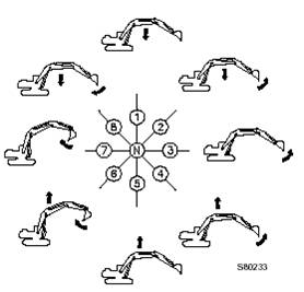 此款挖掘機(jī)具有多功能,可以安裝多種專用前部工作裝置,完成各類作業(yè)。下面只對最簡單的操作進(jìn)行說明。
