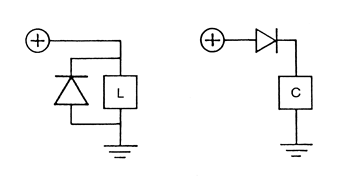 左圖為L-電路和C-電路續(xù)流二極管的接法, 對于存在L-電路和C-電路的地方必須接續(xù)流二極管,以防止脈沖電壓的產(chǎn)生,從而引起電路其它元件的損傷.
