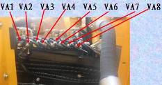 9個先導(dǎo)壓力傳感器,從左側(cè)立板方向到挖掘機左側(cè)方向順序分別為(如圖):動臂下降壓力傳感器,信號線為207號線 鏟斗卸載壓力傳感器,信號線為204;鏟斗挖掘壓力傳感器,信號線為205; 動臂提升壓力傳感器,信號線為206 ; 左行走壓力傳感器線號為:200; 右行走壓力傳感器,信號線為201; 小臂挖掘壓力傳感器,信號線為203; 小臂卸載壓力傳感器,信號線為202; 回轉(zhuǎn)壓力傳感器,信號線為208