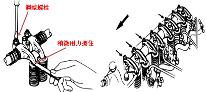 4.盤轉(zhuǎn)曲軸360度,按“雙排不進”方法調(diào)整4缸上止點時氣門間隙