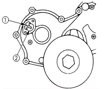 • 順時(shí)針?lè)较蜣D(zhuǎn)到曲軸,使凸輪軸正時(shí)觀察孔指針①和凸輪軸正時(shí)齒輪標(biāo)記“O”對(duì)齊