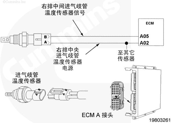 左排中間進(jìn)氣歧管溫度傳感器電路圖向 CENSE™ ECM 提供左排中間進(jìn)氣歧管空氣溫度信號。