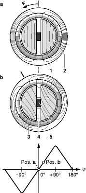 1-磁軛 2-定子(1,2軟鐵)3-轉(zhuǎn)子 4-空氣氣隙 5-霍爾感應(yīng)元件 φ-轉(zhuǎn)角