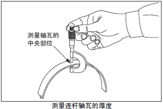 測量連桿軸瓦的中央部位的厚度。超過極限值時(shí),將軸瓦上下整套更換。根據(jù)曲柄銷的磨損程度,在曲軸重新研磨使用時(shí),使用減小尺寸的軸瓦。曲軸的研磨要領(lǐng)參考「發(fā)動機(jī)本體的檢測、修理」的「曲軸的曲柄銷和曲軸頸的研磨」項(xiàng)。