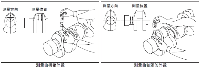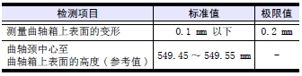(1) 測量曲軸的曲柄銷和曲軸頸的外徑。超過極限值時(shí),使用減小尺寸的軸瓦,按照和減小尺寸軸瓦的規(guī)格研磨曲軸。使用-1.00 mm 規(guī)格的減小尺寸主軸瓦仍然超出極限值時(shí),更換新的曲軸。
