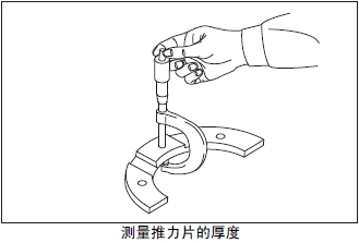 測量推力片的厚度。超過極限值時(shí)更換新的推力片。根據(jù)曲軸的磨損程度,在曲軸重新研磨使用時(shí),使用加大尺寸的推力片。曲軸的研磨要領(lǐng)參考「發(fā)動機(jī)本體的檢測、修理」的「最后端曲軸頸的軸頸寬度研磨」項(xiàng)。