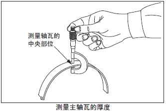 測量主軸瓦的中央部位的厚度。超過極限值時(shí),將主軸瓦上下整套更換。根據(jù)曲軸頸的磨損程度,在曲軸重新研磨使用時(shí),使用減小尺寸的主軸瓦。曲軸的研磨要領(lǐng)參考「發(fā)動機(jī)本體的檢測、修理」的「曲軸的曲柄銷和曲軸頸的研磨」項(xiàng)。