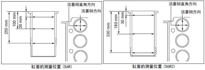 2.5 測(cè)量三菱發(fā)動(dòng)機(jī)缸套的內(nèi)徑選擇缸套內(nèi)側(cè)的上部( 上死點(diǎn)時(shí)No.1 氣環(huán)的位置)、中間部分和O形圈插入部分,沿活塞銷方向及其直角方向,測(cè)量缸套的內(nèi)徑。超過極限值時(shí)更換新的缸套。發(fā)生變形時(shí)重新安裝。