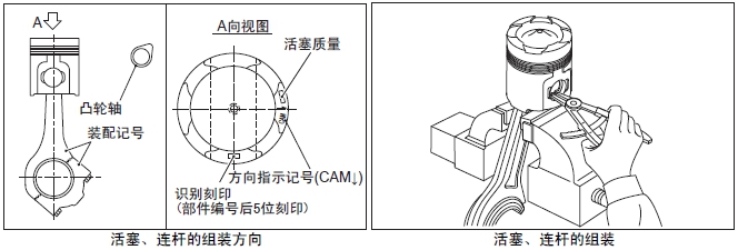 (1) 活塞銷涂抹潤(rùn)滑油后插入,將活塞和連桿組裝在一起。活塞和連桿的組裝方向如圖所示。
