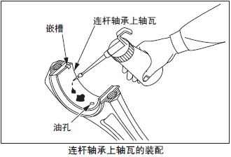 將連桿上軸瓦和連桿大端的嵌槽對(duì)準(zhǔn)后插入,軸瓦的內(nèi)表面涂抹潤(rùn)滑油。這時(shí),要確認(rèn)連桿的油孔和軸瓦的油孔一致。
