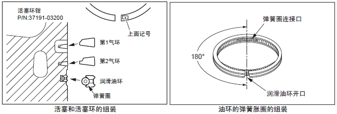 在活塞環(huán)的開口附近,有表示活塞環(huán)上表面的記號(hào)。所有活塞環(huán)的有記號(hào)的面都應(yīng)朝上安裝。