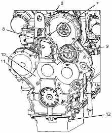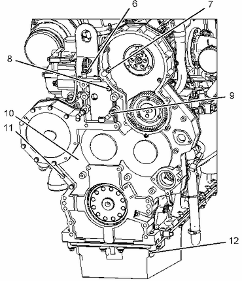 檢查凸輪軸齒輪與可調(diào)節(jié)惰輪齒輪組件之間的齒隙。 此齒隙應(yīng)為 0.356 ± 0.254 mm (0.014 ± 0.010 in)。 參考測試和調(diào)整, "齒輪總成(前)- 正時(shí)",以了解齒隙調(diào)整步驟。擰緊螺母 (12) 和螺栓至扭矩為 55 ± 10 N·m (41 ± 7 lb ft)。